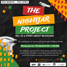 The Nightjar Project draws inspiration from this elusive nocturnal bird and its migration to investigate ideas of movement and homeland, between West Africa, Ghana and the UK. The project takes the rich narrative of migration, folklore, and the particularity of the Nightjar to consider life living under two skies. It will examine cultural and historically views and share stories of land management. It brings together a group of creative, educational and environmental organisations to explore these questions. African Activities and SPUD, supported by the New Forest National Park Authority and New Forest District Council, set out to define the possibilities of creative conversations between these communities. Their aim is to invite us all to think of belonging to places and groups. How we work and live alongside each other and to share our stories of belonging. This is planned as a two-year project, and to set the agenda for further discussions we are starting with an exhibition by Kwame Bakoji-Hume with multiple workshops in storytelling and environmental creativity. This will include a series of ‘Sound Scrapes’ from Ghana and a commissioning of a film by the artist James Elliot looking at land management. The Nightjar Project: Tell Us a Story About Belonging Ghanaian artist, musician and community leader, Kwame Bakoji-Hume, is creating an exhibition of works that shares his story. From his early childhood in Ghana, though building his ‘family’ in a children’s home, migration and how he fits into the bigger picture of dual homelands and being part of an African diaspora in the New Forest, living under two skies. The exhibition is full of symbolic language, embedded storytelling and interpretation within his painting and sculptural works. It’s the excitement of storytelling as a living craft of oral cultures that can tell the story of historic and contemporary ideas of belonging. Within the exhibition we want to invite people to tell their story of belonging, as we build a body of individual stories. From the questions that arise from Kwame’s work and audience responses further work and discussions will be sparked. Kwame Bakoji-Hume’s practice moves fluidly between painting, sculpture, music, community-based arts, and cultural storytelling, exploring themes of identity, belonging, and the interplay between gain and loss. His early life shaped an intimate understanding of impermanence, having left his family at the age of nine to live at the SOS Children’s Village, only to later risk everything as a teenager to reunite with his mother. These formative experiences inform his art, which celebrates resilience, collective joy, and the beauty of shared creativity. Relocating to the UK in 2000, Kwame founded African Activities CIC, a platform for using art to uplift communities and disrupt stereotypes about African cultures. His practice remains deeply rooted in community engagement, collaborating with craftsmen, children, and marginalized groups alike to democratize creativity and celebrate cultural heritage.